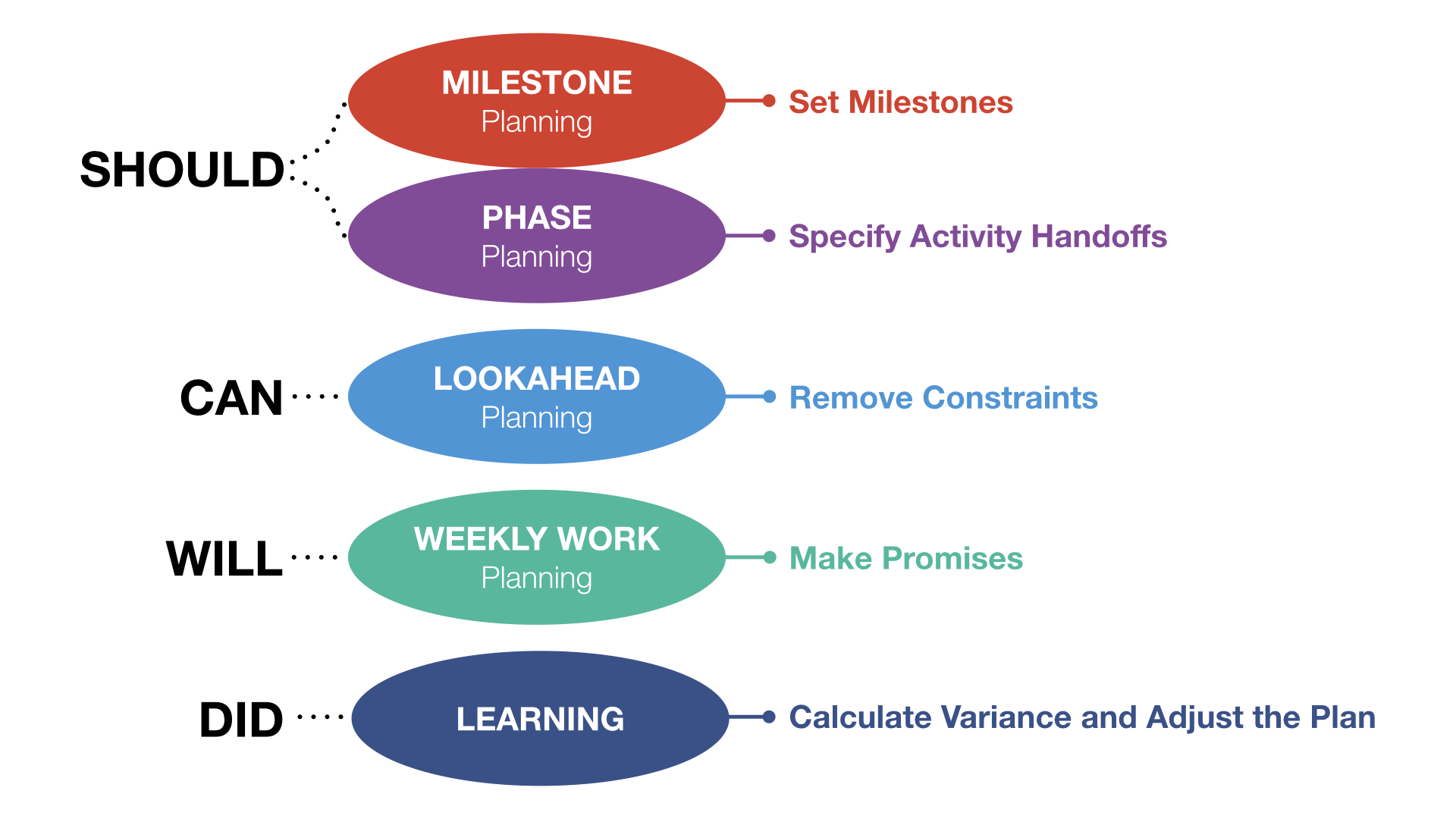 LPS breaks down planning into SHOULD, CAN, WILL, and DID where the "Last Planners" (the Foremen and Superintendent) are actively engaged in the planning of work, since they are the experts with the experience and knowledge of their individual crafts.